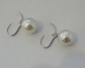 Die beiden stattlichen Südseeperlen von jeweils 10,5mm Durchmesser werden gekrönt von einer Reihe aus je 11 Brillanten. Die Fassungen der Brillanten und Perlen sind bewusst schlicht gehalten. Die Steine und Perlen kommen so gut zur Geltung. Die Perlen sind beweglich befestigt.