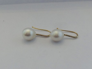 Die beiden weißen Südseeperlen haben einen Durchmesser von 12 mm x 10 mm und werden gekürt von einer Reihe aus jeweils 9 Brillanten. Die Hänger, auf denen die Brillanten sitzen, sind fein und schlicht gehalten, damit die Perlen mit ihrem schönen Lüster perfekt zur Geltung kommen.