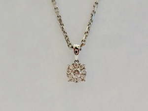 In diesem topaktuellen, eleganten Collier sitzt ein etwas größerer Brillant 0,16 carat, der Ein Reihig mit kleinerern Brillanten umringt wird! Das Brillantfeuer wird bei jeder Bewegung in alle Richtungen versprüht. Der Anhänger wird von einer Weißgold-Kette mit einer Länge von 44 cm (Zwischenöse bei 42 cm) gehalten, die im Preis inbegriffen ist.